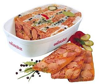 Aspikspezialität - nur Echt mit der Krone, mit mageren Fleischstücken, fein würzig süß-sauer mariniert, dünne Schmalzschicht mit Gemüsedekor, 1 Stück im Karton, 6 Stück in E2 Satte.