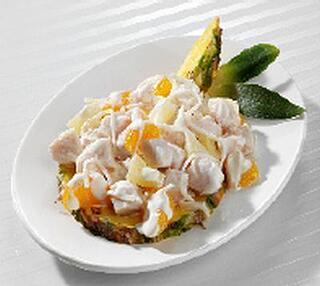 Geflügelfleisch (aus Fleischstücken zusammengefügt) mit Ananas, Mandarinen und Sellerie in einem fruchtigen Mayonnaisen-Dressing