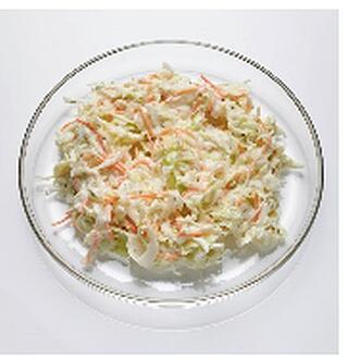 Weißkohl-und Möhrenstreifen in einer würzigen Salatcreme mit Dill.